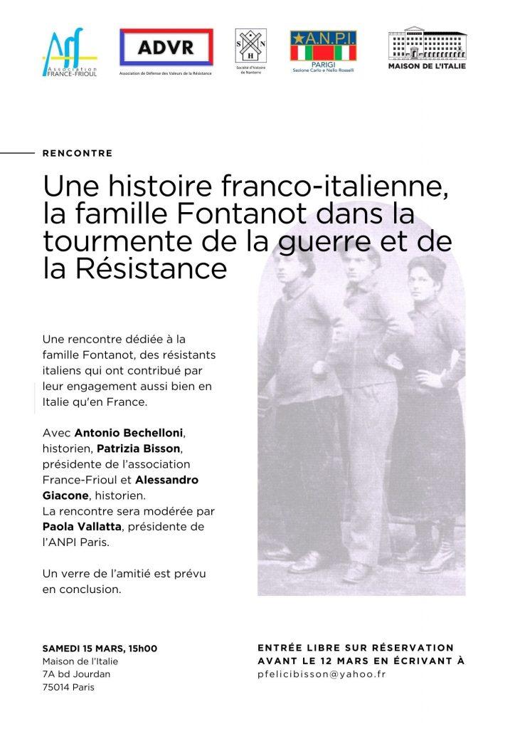 Colloque organisé par l’Association France-Frioul, la Maison de l’Italie, l’ADVR, la Société d’Histoire de la ville de Nanterre, l’Association nationale des partisans italiens de Paris (ANPI-Paris) Colloque du 15 mars 2025, Maison de l’Italie, Cité universitaire.